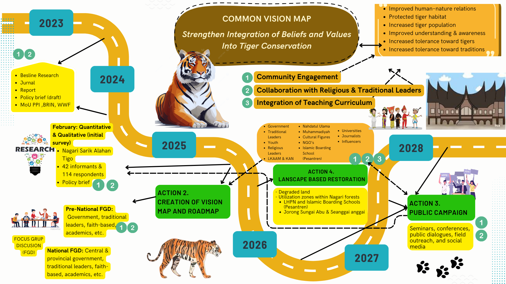 Kami yakin kearifan lokal yang muncul dari pembelajaran khasanah pengetahuan yang terwariskan dan dapat menjaga alam dengan dengan cara otentik, dapat membantu pelestarian alam secara signifikan. Bersama para tokoh, agama (Islam), tokoh adat, akademisi dan peneliti konservasi berbasis budaya dan spiritualitas, kami berhasil membuat Visi Peta Jalan (LIHAT: Common Vision Map, Indonesia, English), untuk memberikan sumbangan pada pengembangan pendekatan konservasi harimau dan habitatnya berbasis budaya.